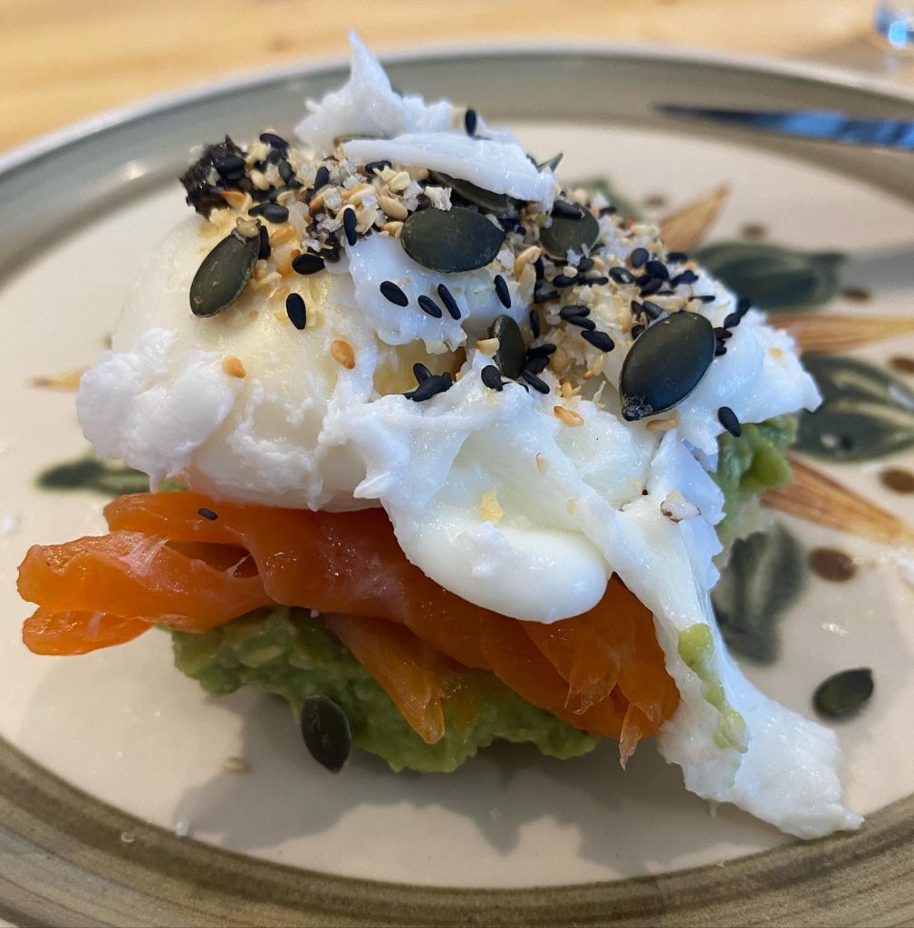 3. Œufs pochés au saumon fumé, avec de l’avocat écrasé et un mélange de graines ou de poivre noir.