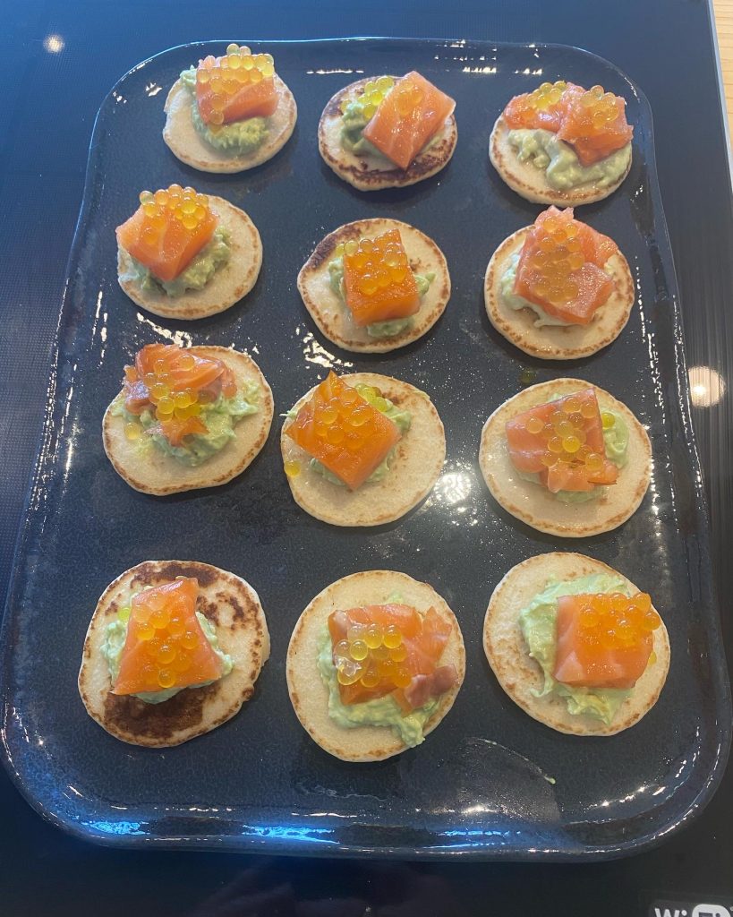 4. Canapés, sur blinis avec un mélange d’avocat et de crème fraîche, et des perles de saveurs citronnée ou yuzu.