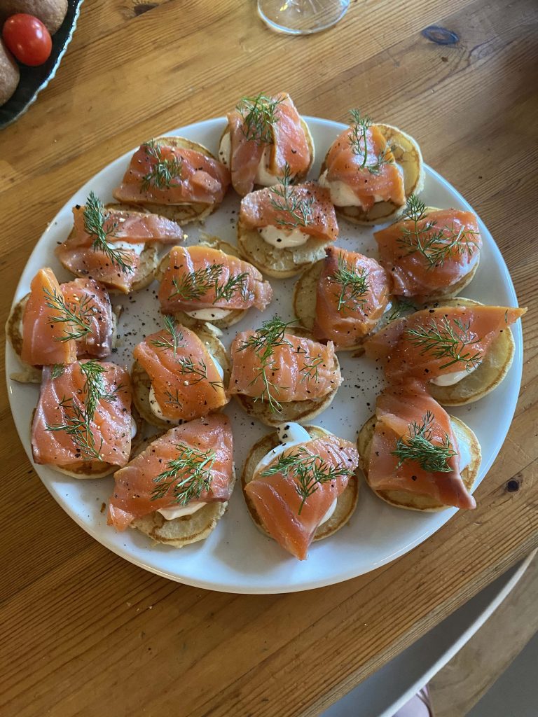 6. Canapés, sur blinis à la crème fraîche et à l’aneth frais.