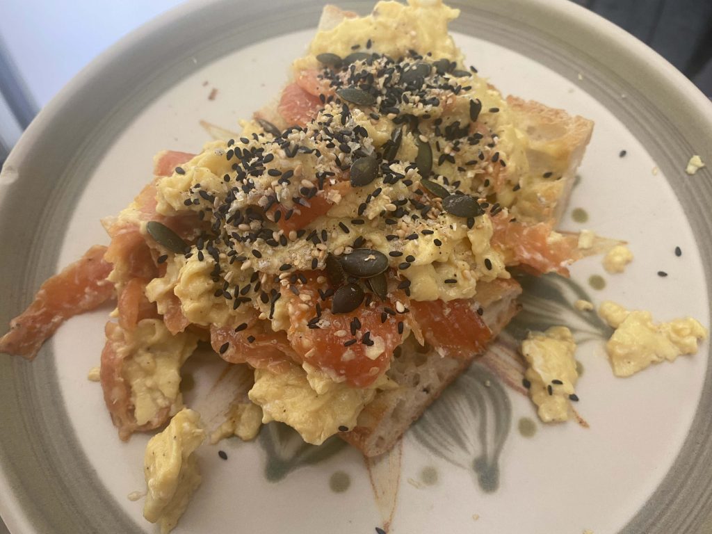 1. Œufs brouillés au saumon fumé – faites cuire vos œufs comme vous le souhaitez, puis hachez le saumon et mélangez-le à la fin de la cuisson, ou superposez le saumon sur les œufs et les toasts, avec un mélange de graines sur le dessus.